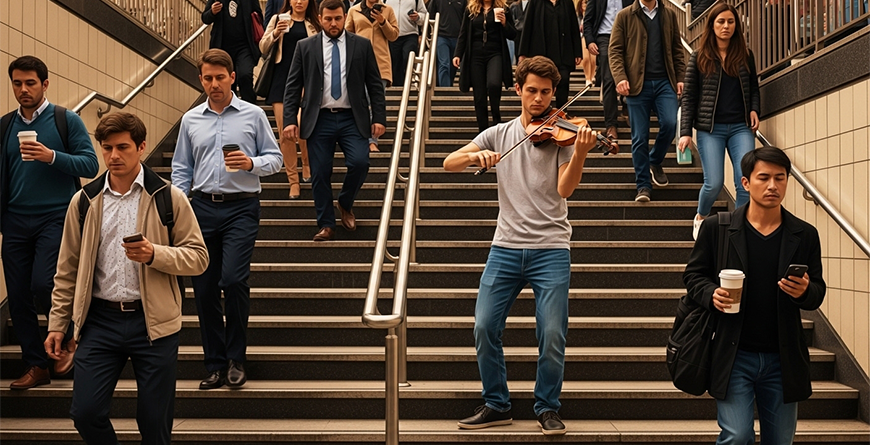 Un joven violinista desciende del metro de Washington, DC, vestido simplemente con jeans y camiseta. Se coloca junto a las escalinatas de acceso, abre su estuche, y apoyando el violín correctamente sobre su hombro, comienza a interpretar con entusiasmo frente a la multitud que transita durante la hora pico.